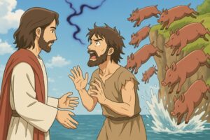 彼は悪霊に憑かれ、墓場に住み、社会からも人間らしさからも切り離されていました。周囲の人々は彼を鎖で縛ろうとしましたが、その力でも彼を救うことはできませんでした。彼の叫び、自傷行為は、罪と絶望に満ちた魂の苦しみを物語っています。ここに、「心の嵐」の姿が生々しく描かれています。