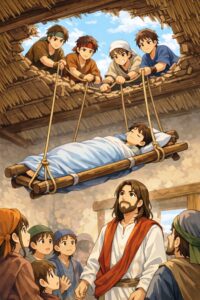 その中に、四人の人に運ばれてきた一人の中風(麻痺)の者がいました。群衆のためにイエス様に近づくことができなかった彼らは、なんとイエス様がおられるあたりの屋根をはぎ、穴をあけて、中風の者を寝かせたまま床をつりおろしたのです。これは、相当に常識外れの行動であり、彼らの強い信仰と、病人をイエス様の元へ連れて行きたいという深い愛が表れています。