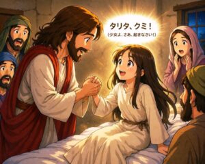 イエス様は少女の手を取って《「タリタ、クミ」》(《「少女よ、さあ、起きなさい」》という意味のアラム語)と言われました。